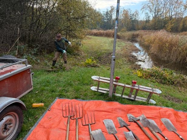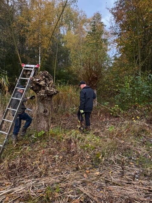 Deze zaterdag zijn er bijna twintig mannen en vrouwen naar Park Staddijk gekomen om nog een laatste keer dit jaar te klussen in het Bloemendal. Obco’s Geerten en Cyril hadden een mooi lijstje met verschillende klussen, waarvan er enkele snel klaar waren (knotten van wilgen), maar andere nooit af zullen komen (verwijderen van jonge berken, eiken en populieren). Het was heerlijk werkweer. Twee knotwilgen aan de slootkant zijn weer netjes bijgewerkt, terwijl in een andere hoek van het terrein een drietal jonge wilgen zo gesnoeid is dat ze later mooie knotten gaan worden.