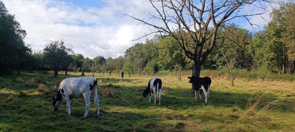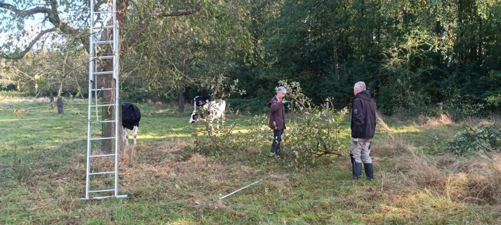 Maïta heeft weer wat trainingsuurtjes met de boszeis erop zitten. Conclusie: De bramenbos is te groot om met de hand door vrijwilligers te laten doen: dit is te intensief. SBB zal hier zelf aan de slag moeten. Wim vertelt dat in het begin van ons beheer van de boomgaard de bosrand veel verder van het prikkeldraad af stond: daar kon een tractor langs.
