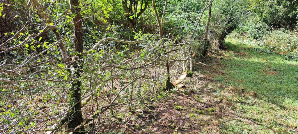 Bij de dode eik is de aanplant van meidoorn goed gaan groeien. Dit stuk zal volgend seizoen of het seizoen daarop klaar zijn om gelegd te worden. Zo wordt de heg langzaamaan 1 geheel.