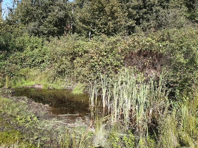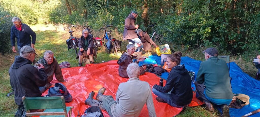 Ton is met een klein groepje in en bij de poel aan de slag gegaan. Het is een mooie poel met mosgroei aan 1 kant. Het sporkehout blijft staan. Wat opvalt is dat aan 1 kant veel gras de poel ingroeit. Onderhoud blijft dus belangrijk. Verder valt het Ton op dat hij vandaag weinig libellenlarven heeft gezien.